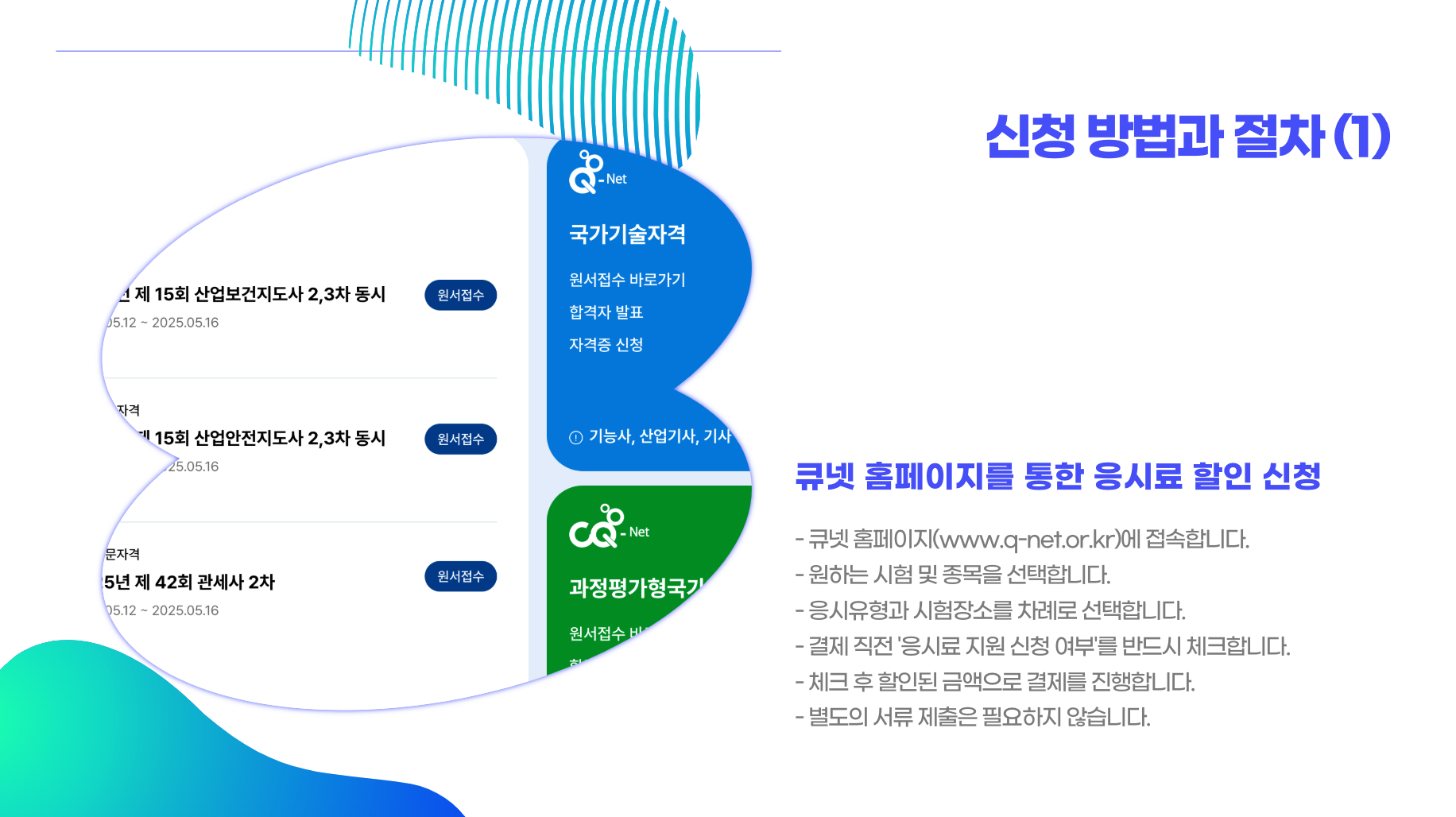 | PC | 큐넷 접속 → 시험 선택 → 접수 진행 → '응시료 지원' 선택 → 할인 적용 결제 |