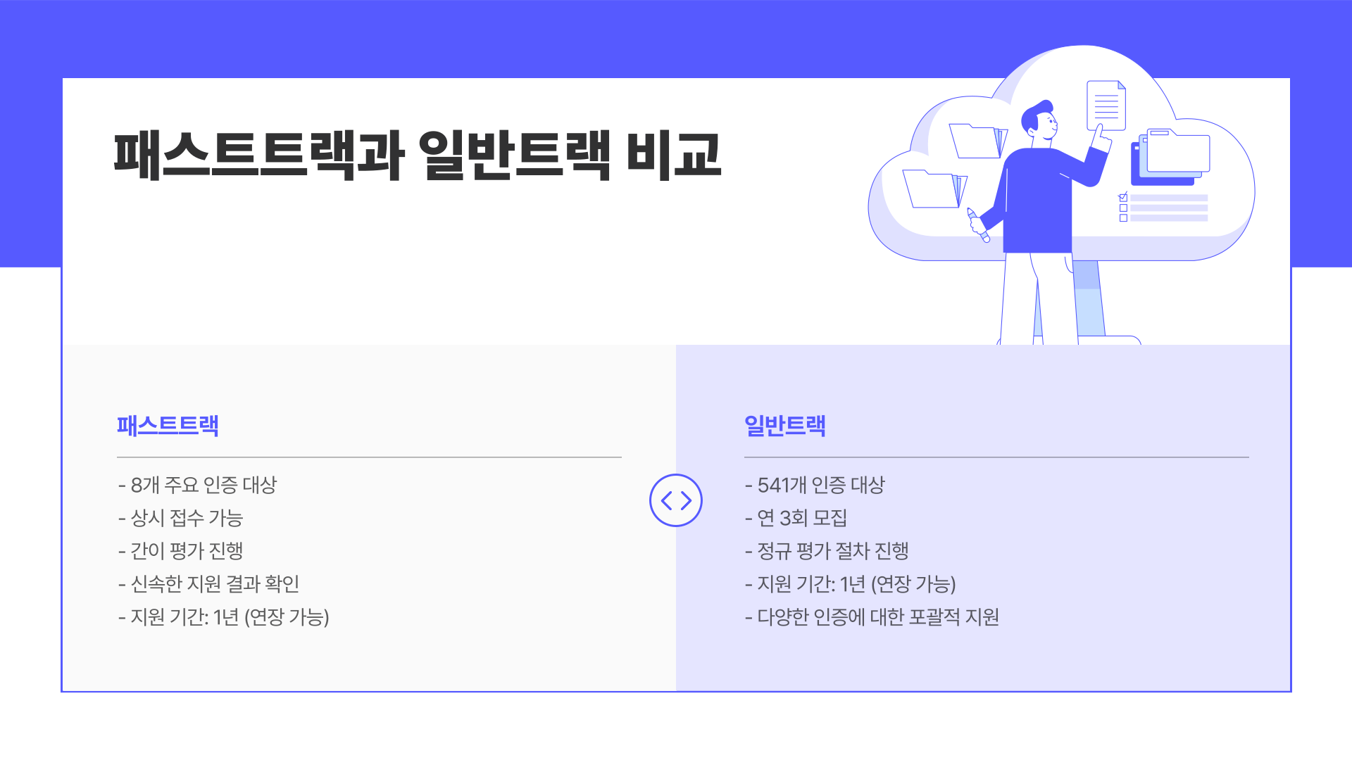 지원 방식은 두 가지 트랙으로 나뉘어요. 첫 번째는 ‘패스트트랙’! 말 그대로 빠르게 신청하고 빨리 지원받는 구조에요. 8개 주요 인증에 한해서는 상시 접수되며, 평가도 간이로 이뤄지기 때문에 지원 결과도 빨리 나온답니다.