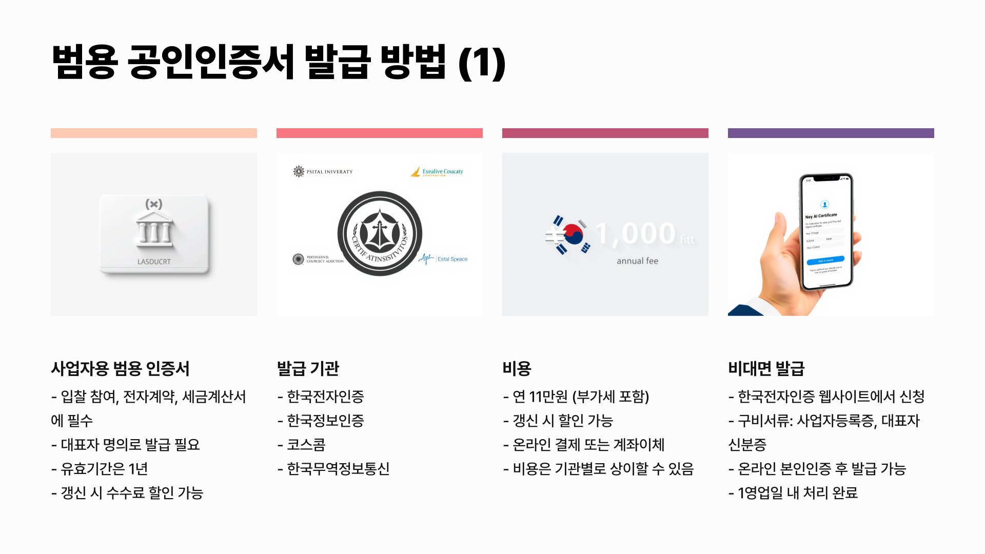 사업자용 범용 인증서의 경우, 연 11만원으로 4개 기관(한국전자인증, 한국정보인증, 코스콤, 한국무역정보통신)에서 발급 가능하구요. [한국전자인증 비대면 발급](https://www.crosscert.com/glca/01_10_01.jsp) 링크에서 바로 신청할 수 있어요!
