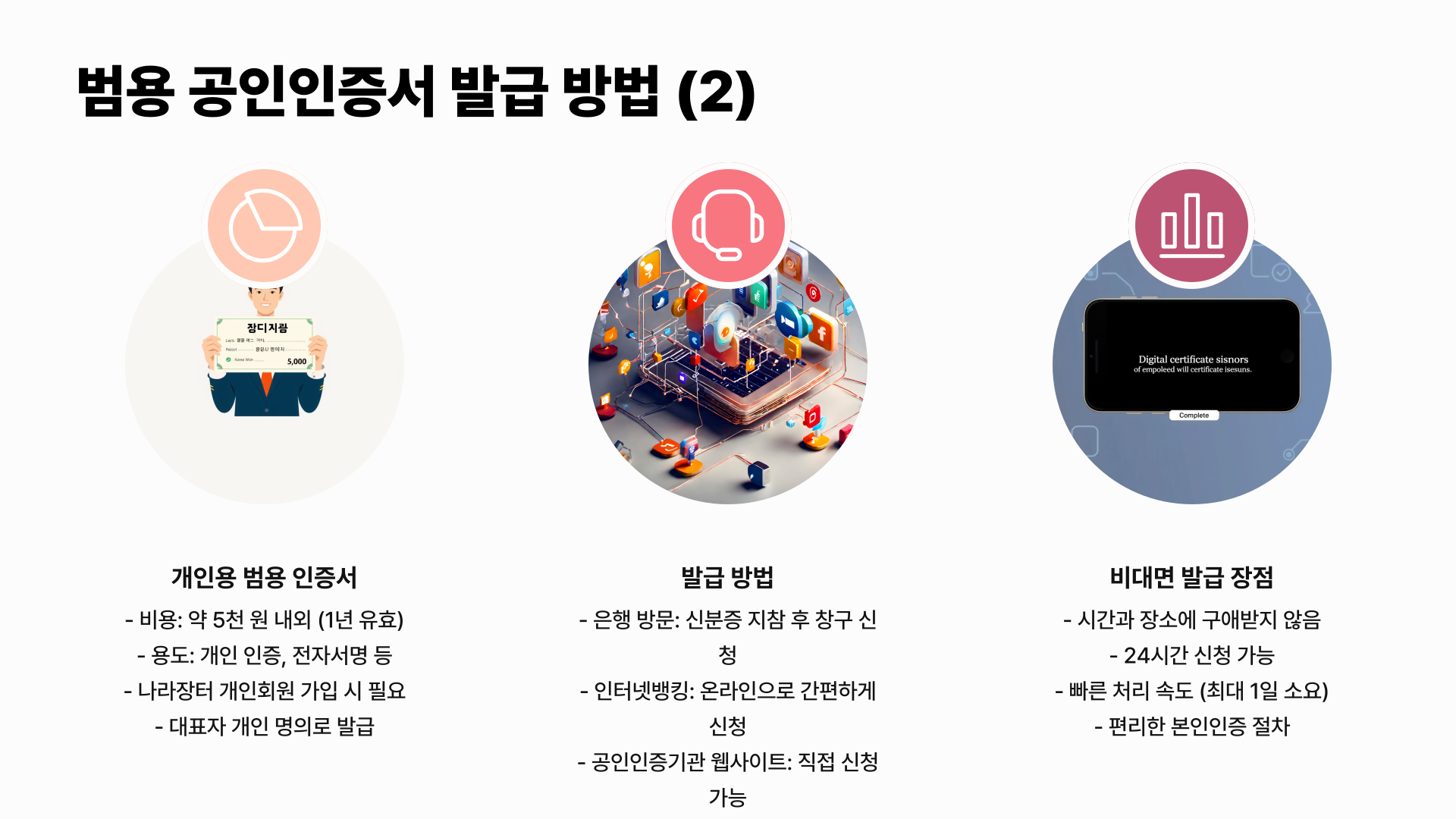 개인용 범용 인증서는 가격도 저렴해서 보통 5천 원 내외예요. 은행이나 인터넷으로 간단하게 받을 수 있어서 부담 없구요!