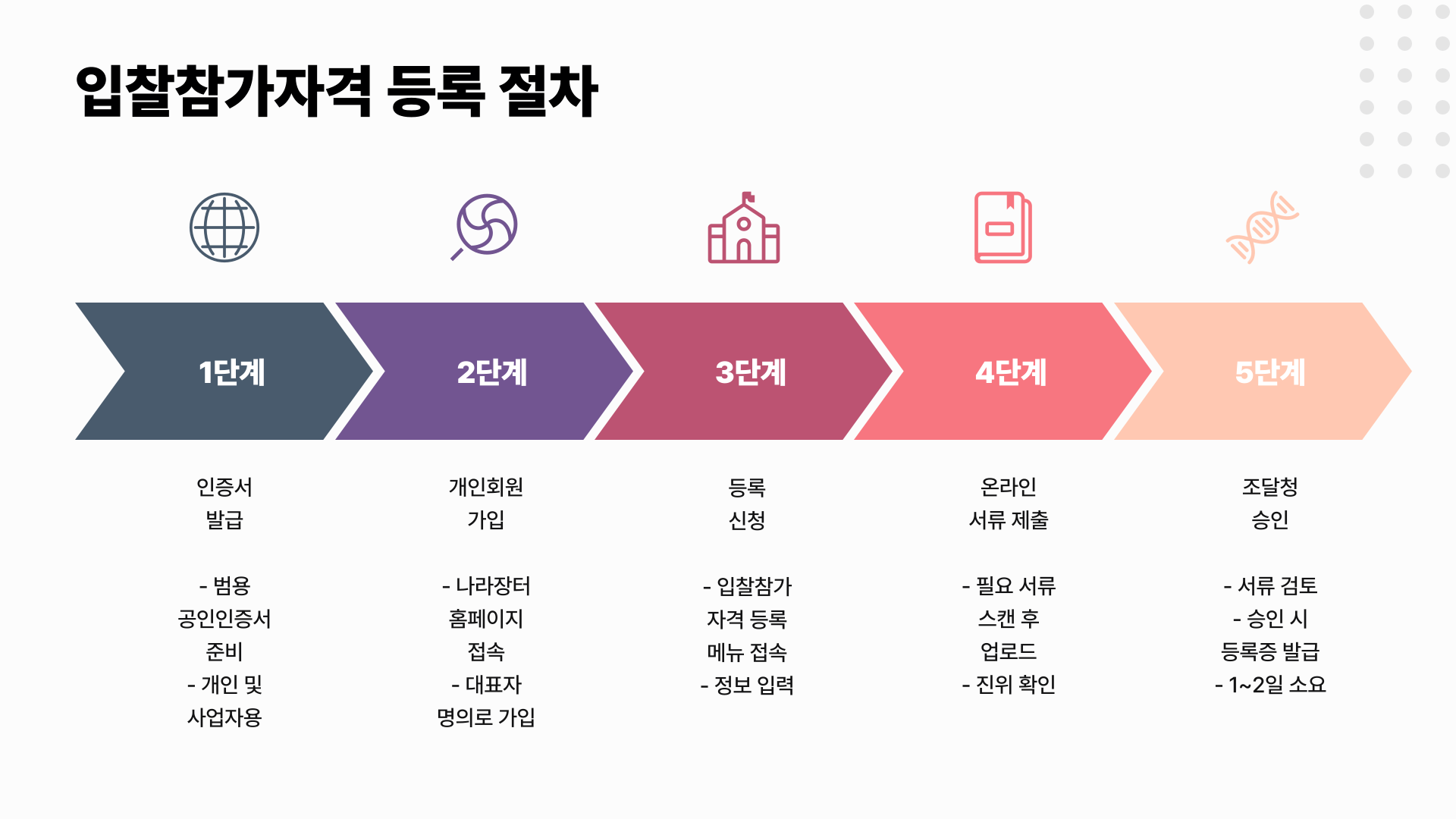 먼저 필요한 인증서를 발급받고, 나라장터 개인회원 가입 후 등록 절차를 밟는 순서입니다. 아래 요약된 절차를 한 번에 보실 수 있게 정리해봤어요.