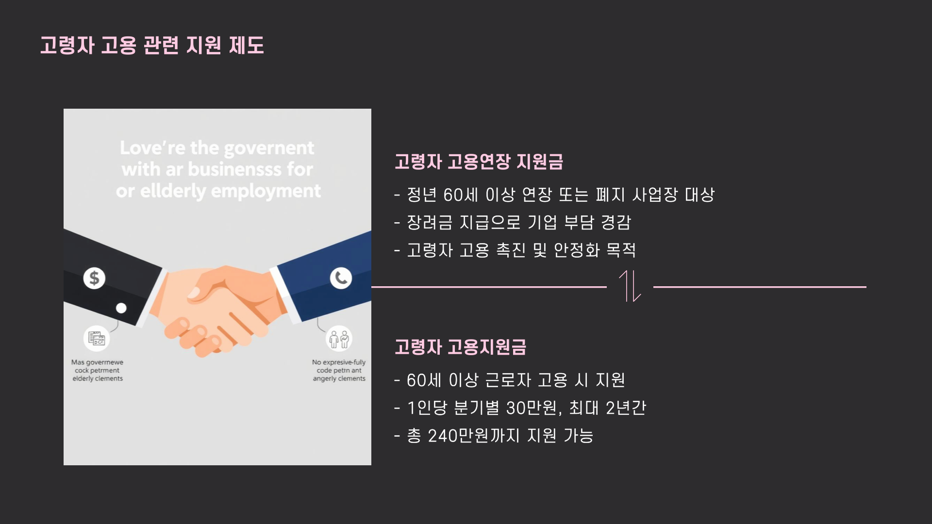 또 하나는 고령자 고용지원금인데, 60세 이상 직원을 고용한 기업이 조건을 충족하면 1인당 분기별로 30만원씩, 최대 2년간 받을 수 있어요. 총 240만원까지 가능하다고 해요!