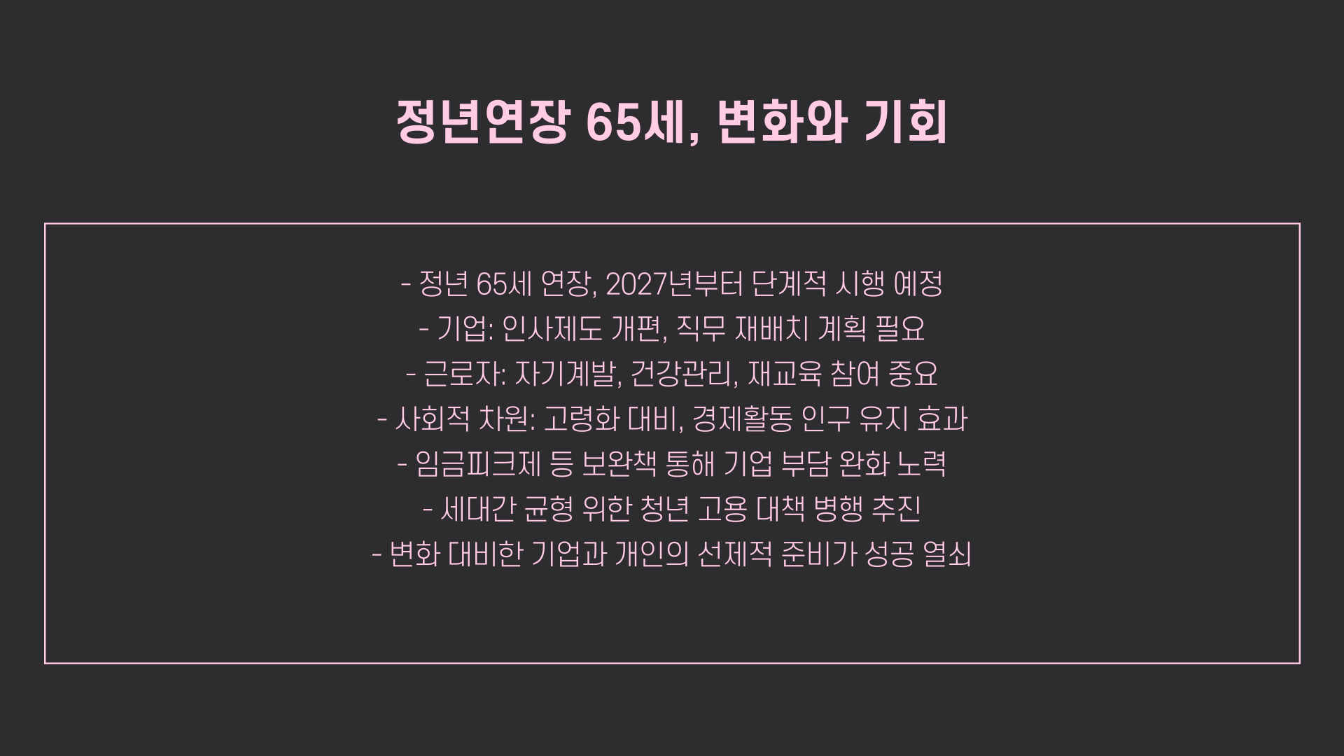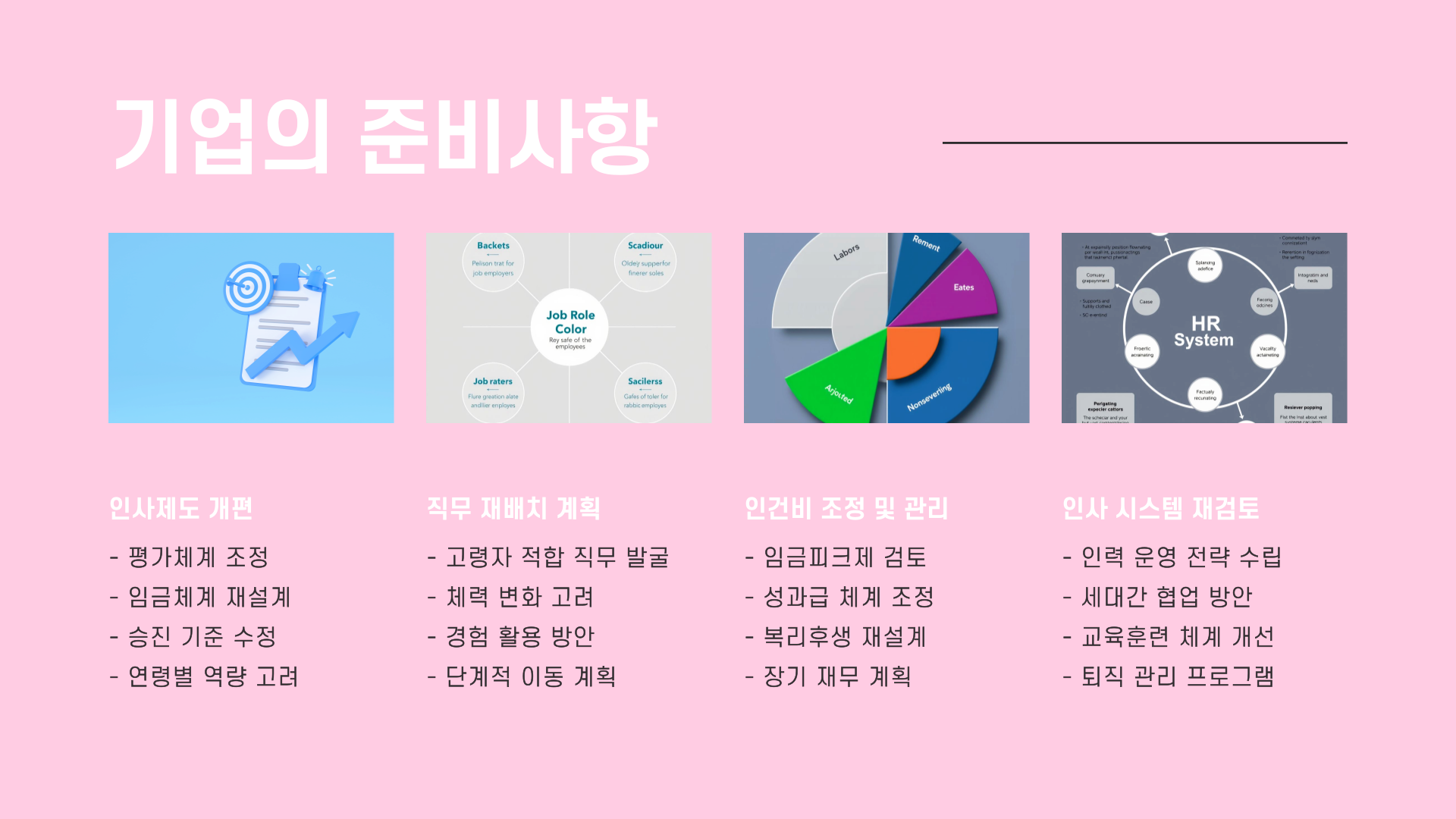 기업은 인사제도 손 봐야 돼요. 평가체계, 임금 체계, 승진 기준 등 다 바꿔야 하구요. 직무 재배치도 중요해요. 나이 들면 체력 달라지니까요!