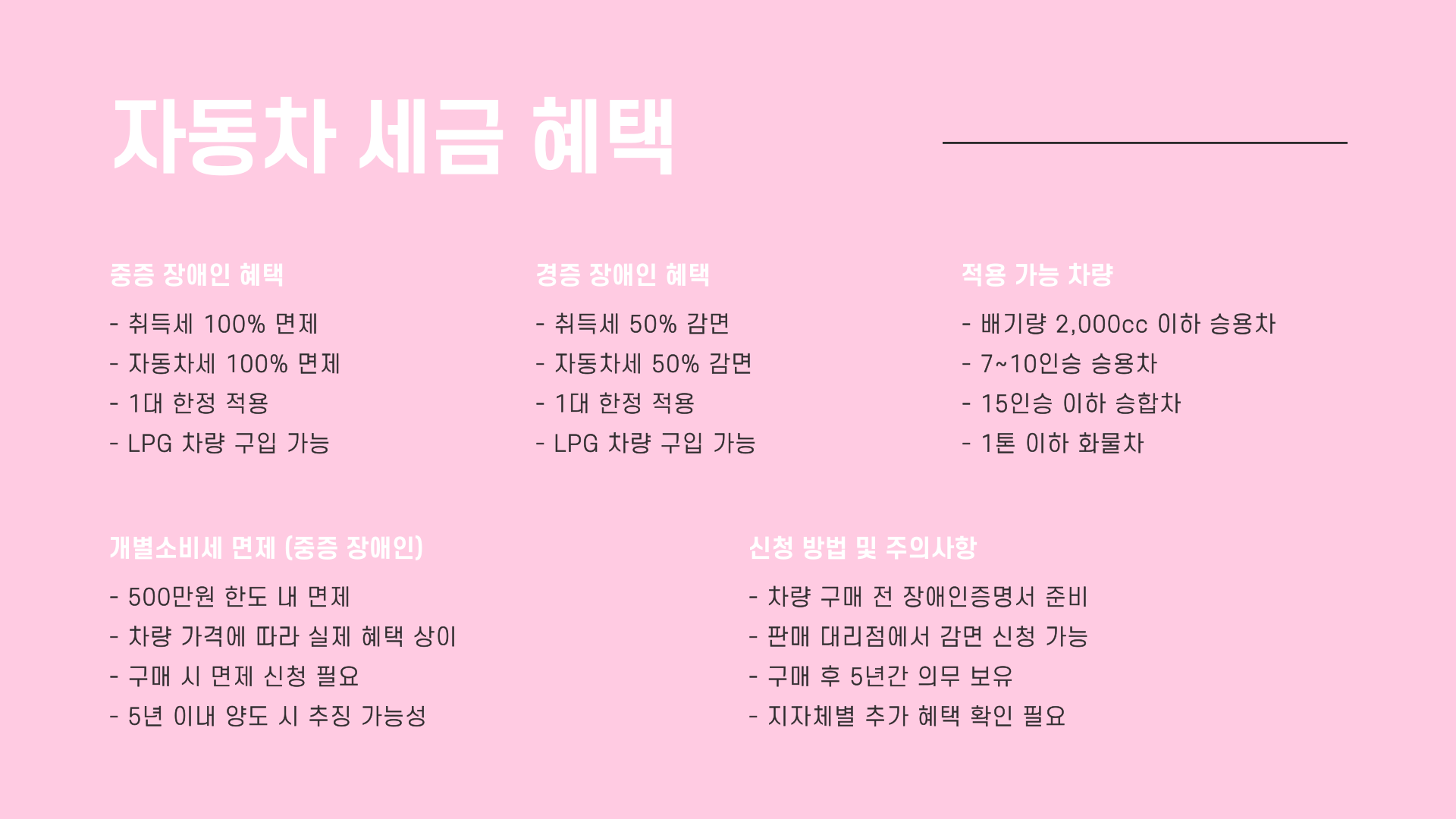 | 자동차세 감면 | 중증 100%, 경증 50% | 1대 한정 | 취득세 포함 |
