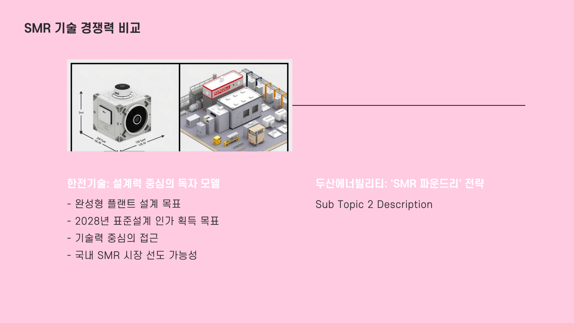 여기서 한전기술은 '설계력'으로 SMR 설계를 직접 주도하고 있어요. 완성형 플랜트 설계를 목표로 하는 만큼 기술력 중심의 플레이어죠. 반면 두산에너빌리티는 'SMR 파운드리' 전략으로 다양한 회사에 부품을 공급하는 다변화 전략을 취하고 있어요. 뉴스케일과는 이미 주기기 계약도 체결한 상태고요.