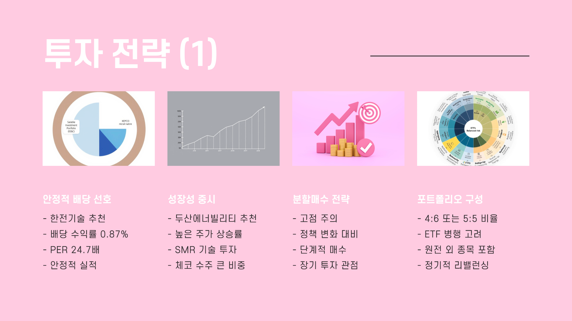 그리고 원전주는 변동성이 큰 편이에요. 정부 정책이나 국제 정세에 민감하니까 분기별로 포트폴리오 리밸런싱하면서 적절히 조정해주는 게 좋아요. 포트 구성은 4:6 또는 5:5로 두 종목 다 가져가는 전략도 추천드려요. ETF랑 같이 묶는 것도 방법이고요.