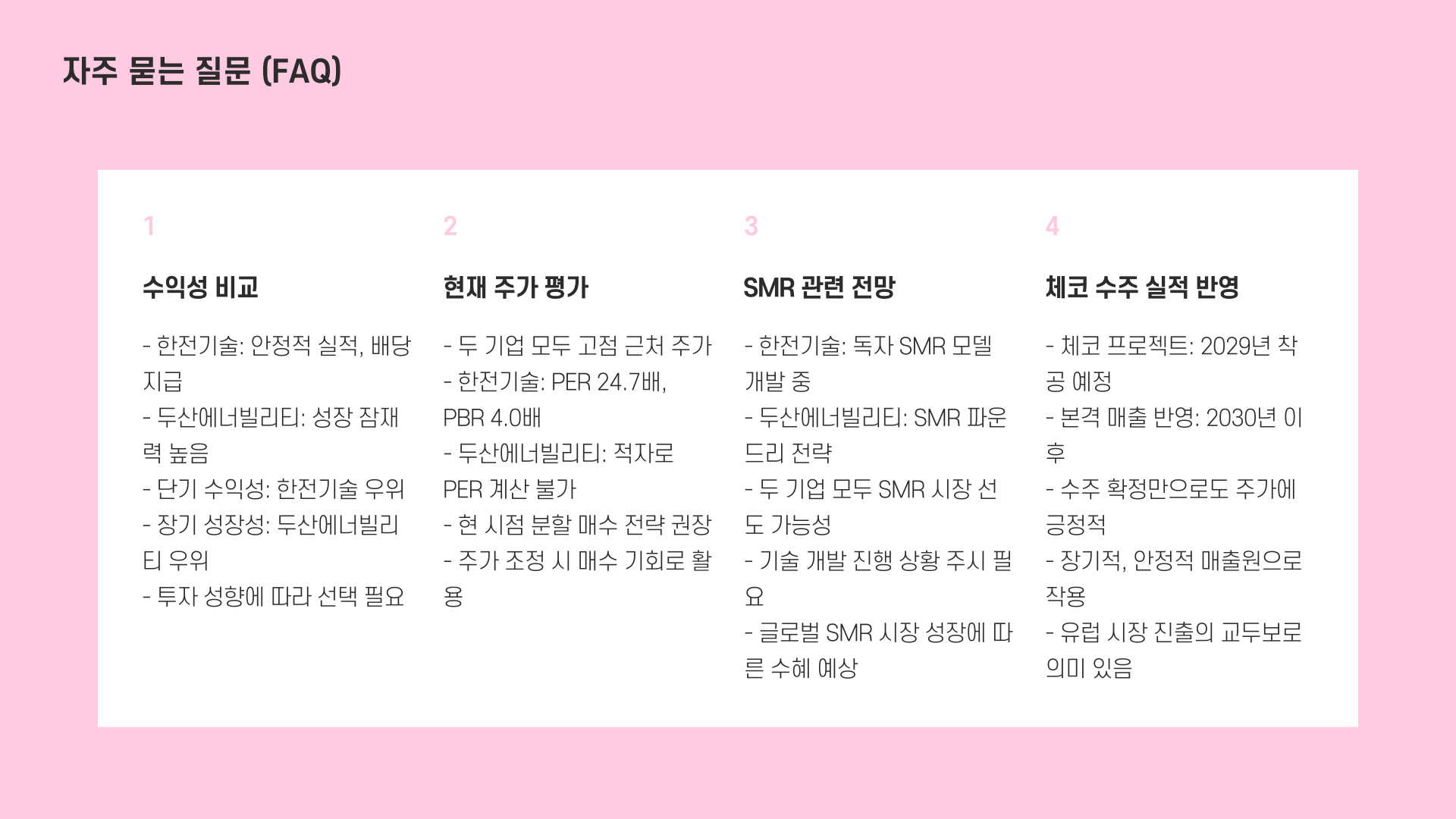 기술력 면에선 한전기술, 생산력과 글로벌 공급망은 두산에너빌리티예요. 둘 다 방향은 다르지만 SMR 시대를 이끌 주요 주자라 판단돼요.