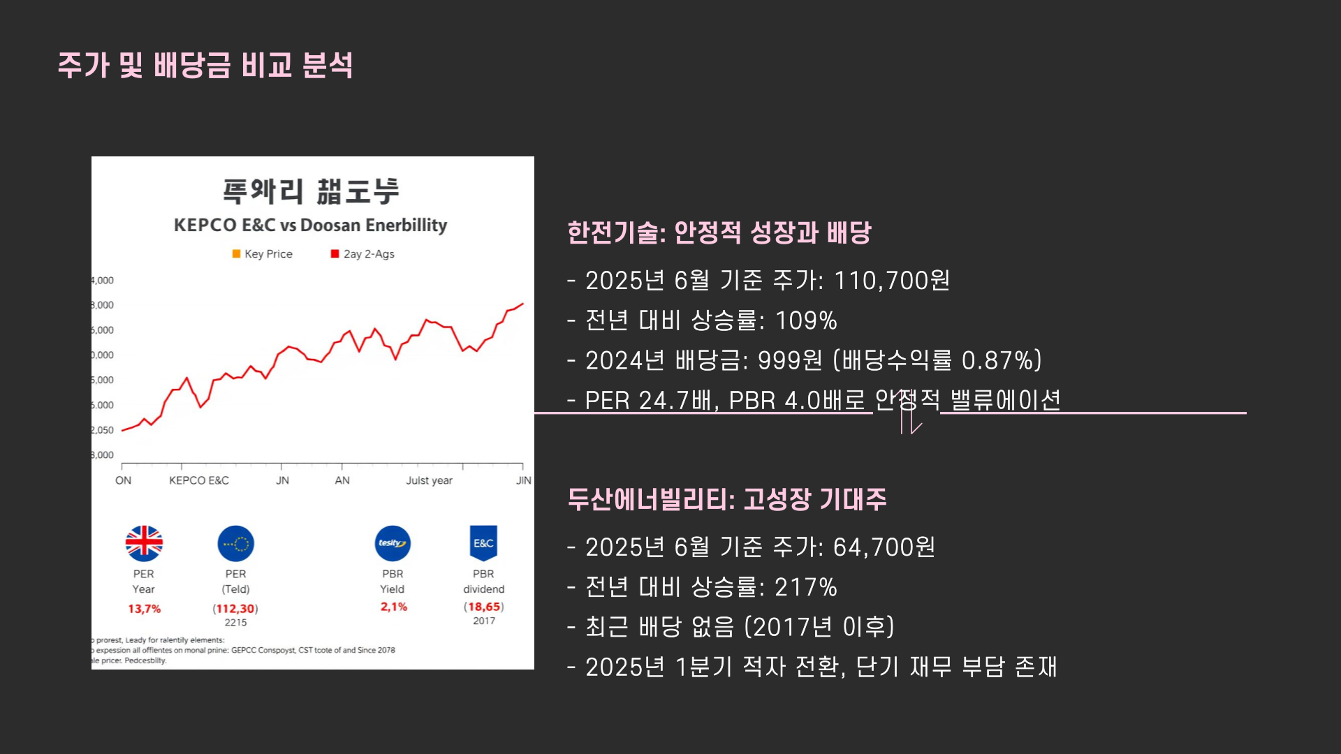 PER, PBR 기준으로 보면 한전기술은 PER 24.7배, PBR 4.0배 수준이고, 두산은 PER이 음수로 표시될 정도로 실적이 아직은 안정적이지 않다는 점, 이건 좀 주의하셔야 해요. 그러니까 고배당 안정형이면 한전기술, 고성장 기대형이면 두산, 이렇게 분류가 가능한 거죠.