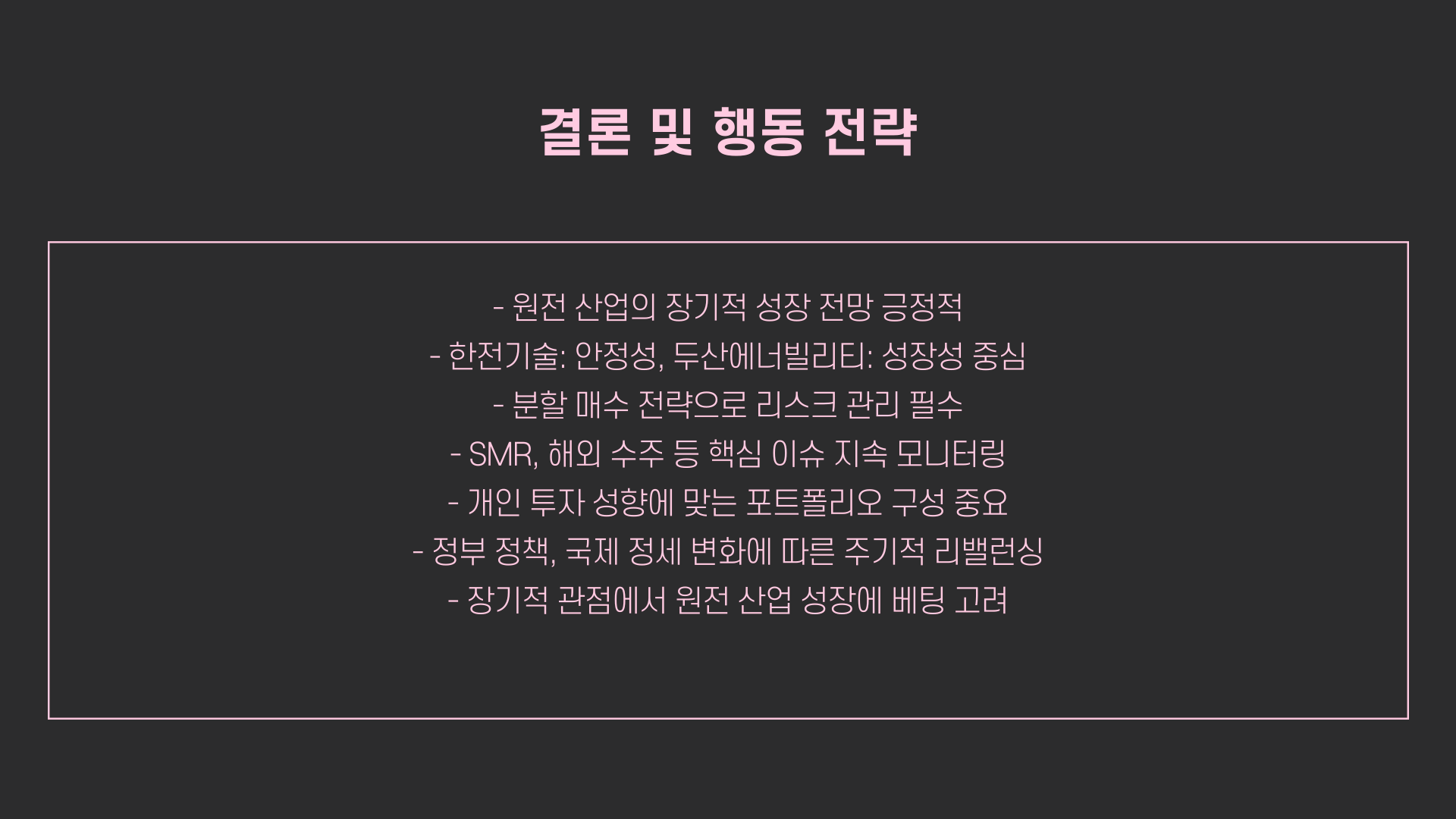 그리고 SMR, 이건 진짜 미래 먹거리 중 하나니까 무조건 관심 갖고 지켜보셔야 해요. 두산의 생산능력 확대 계획이나, 한전기술의 독자 모델 추진 같은 건 모두 중장기적으로 주가에 긍정적이거든요. 그래서 장기 투자, 리밸런싱, 분산 전략. 이 세 가지는 꼭 기억해 두셨으면 좋겠네요!
