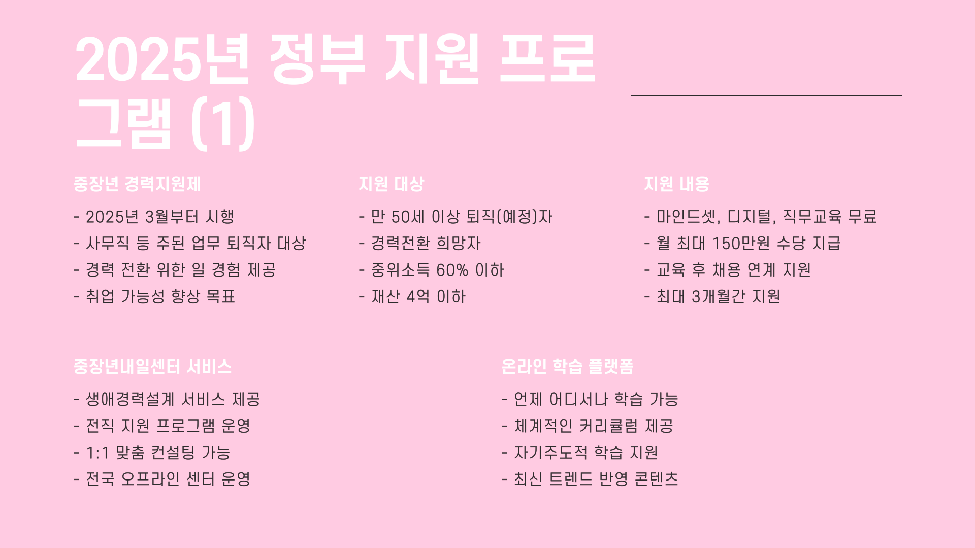 - 대상: 만 50세 이상 퇴직(예정)자 중 경력전환 희망자