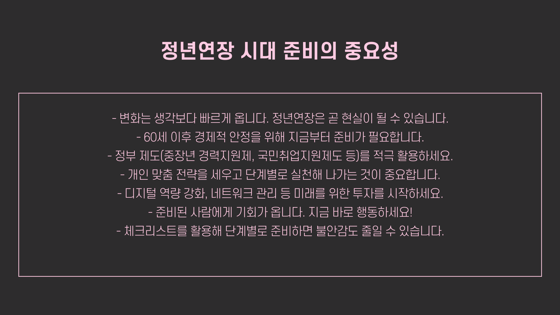 오늘 내용 정리하시느라 고생 많으셨어요! 정년연장이라는 변화 앞에서 불안하기보다는, 하나씩 차근히 준비해보세요. 이 글에서 소개한 제도, 방법, 체크리스트만 잘 활용해도 진짜 많은 차이가 나더라구요!