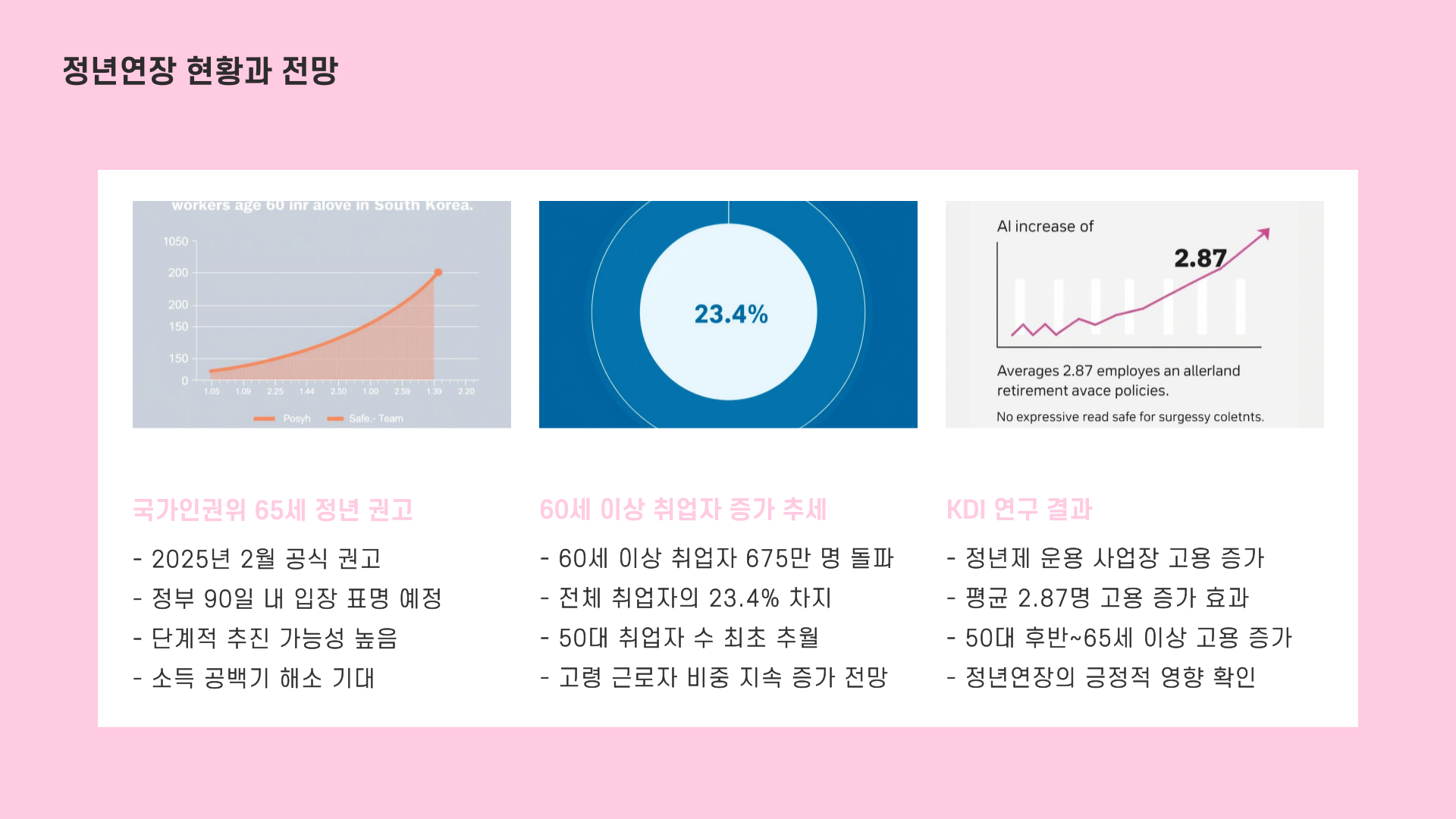 KDI 연구 결과도 있어요. 정년제 운용 중인 사업장에서는 평균 고용 인원이 2.87명이나 늘었대요. 특히 50대 후반, 60대 초반, 65세 이상까지 다양한 세대에서 일자리가 늘어난 게 인상적이었구요. 어쨌든 중요한 건, 이 흐름에 올라타야 생존이 가능하다는 거예요!