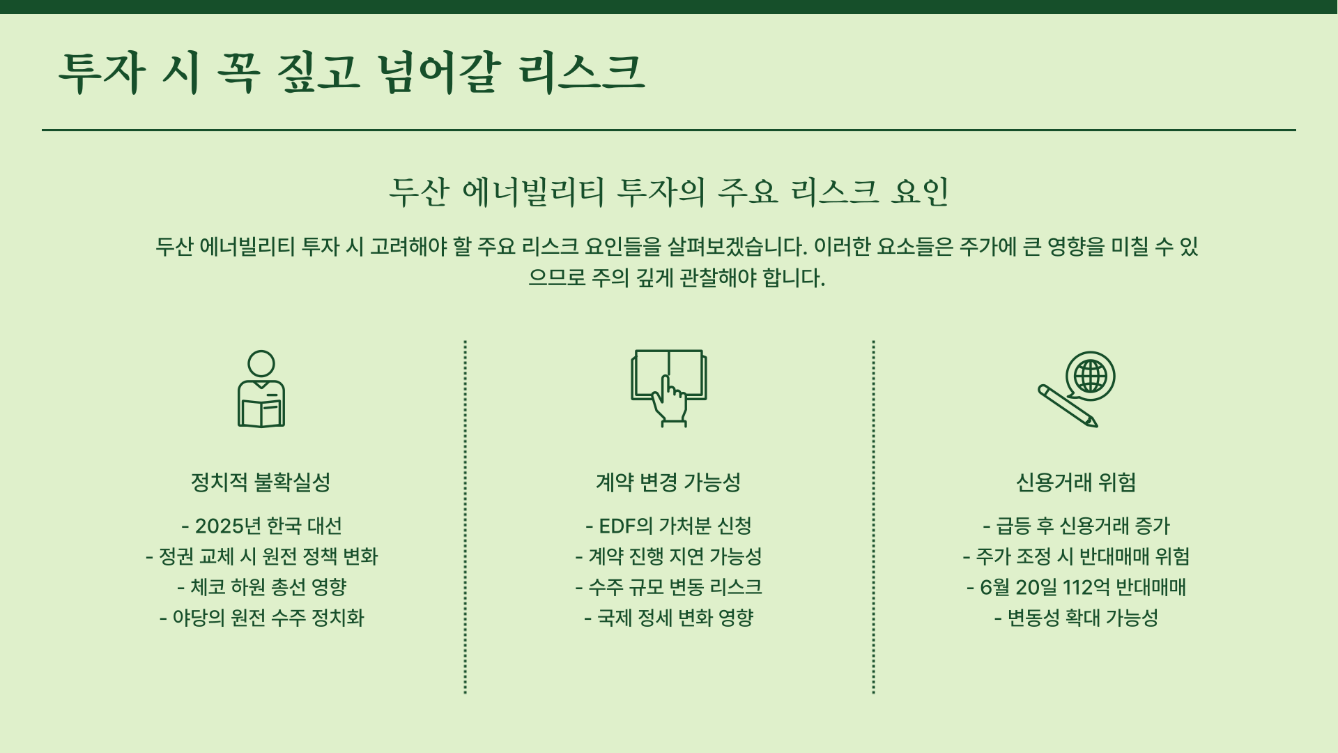 모든 게 좋아 보이는 두산 에너빌리티에도 물론 리스크는 있어요. 요즘처럼 정치 상황이 불확실할 땐, 대형 수주가 실제로 언제 진행될지, 혹은 변경될 가능성도 열어둬야 하거든요.