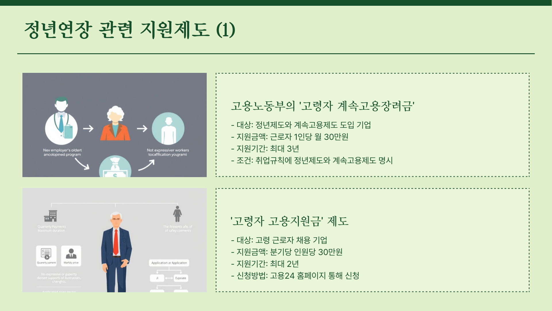 지금처럼 정년연장 논의가 있는 상황에서는, 고용을 유지하는 데 필요한 정부 지원제도도 함께 알아두면 좋아요. 2025년 기준, 고용노동부가 운영하는 '고령자 계속고용장려금'과 '고령자 고용지원금'이 있어요. 이건 실제로 정년을 연장하거나 고령자 채용을 늘린 기업에게 금전적으로 도움을 주는 제도예요.