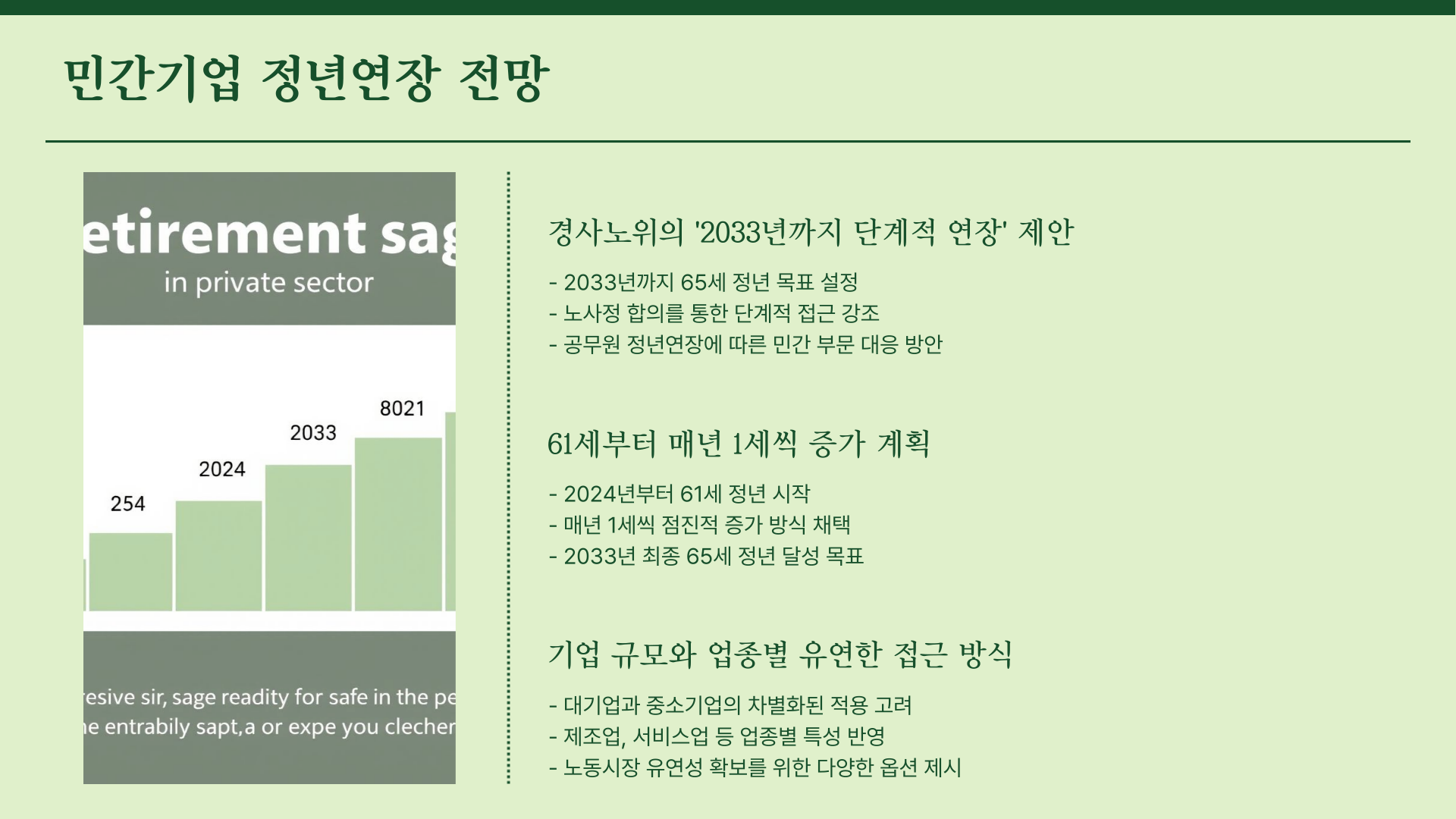 민간기업의 정년연장은 아직 본격적으로 시작된 건 아니지만, '시간문제'라는 분위기가 팽배해요. 특히 경사노위가 제시한 '2033년까지 단계적 연장'안이 주목을 받고 있어요. 요약하면, 61세부터 시작해서 매년 1세씩 늘려서 2033년까지 65세로 만들겠다는 거죠.