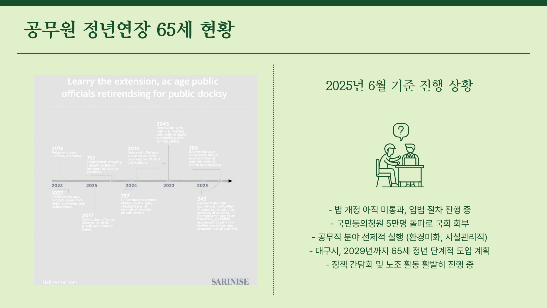 무엇보다도 눈여겨봐야 할 건 공무직 분야에서는 벌써 실행 단계에 들어갔다는 거예요. 행정안전부가 환경미화·시설관리직 공무직 2,300여 명 대상으로 65세 정년 적용을 시작했고, 대구시는 아예 매년 1년씩 정년 늘리는 방식으로 2029년까지 65세 맞춘대요. 보다 자세한 방법은 아래에서 확인하세요.