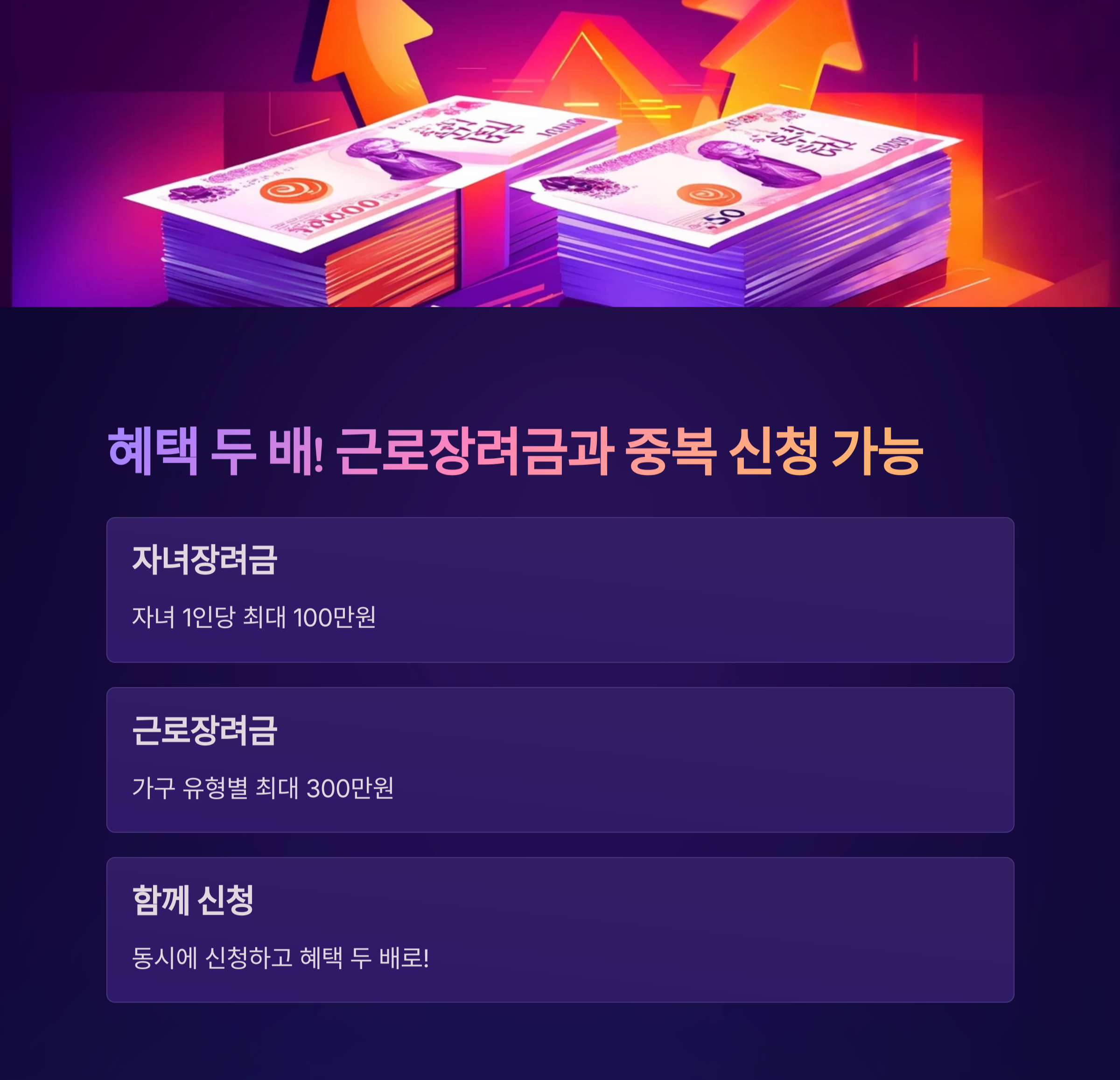 정부가 근로 의욕을 높이고 자녀 양육 부담을 줄이기 위해 마련한 중요한 제도입니다. 특히 요즘처럼 경제 여건이 불확실한 시기에는 이 지원금이 가계에 큰 힘이 될 수 있습니다.
